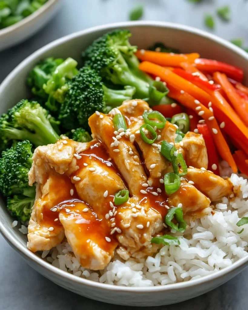 Assemble the Bowls: Spoon the chicken and vegetable mixture over the rice.